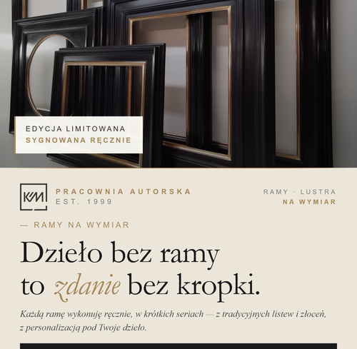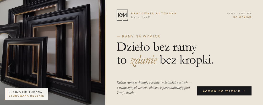 Każdy projekt traktuję indywidualnie. Ramy i lustra nie są produktem seryjnym – powstają z myślą o konkretnym obrazie, wnętrzu i oczekiwaniach klienta. Dzięki temu masz pewność, że finalny efekt będzie jedyny w swoim rodzaju.