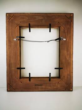 Rama jest ręcznie przygotowywana w pracowni, z naciskiem na precyzję obróbki i spójność powierzchni. Wykończenie budowane jest etapami, tak aby kolor i struktura nie dominowały obrazu, lecz tworzyły dla niego spokojne obramowanie.