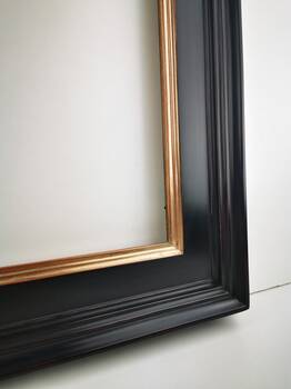 Rama ma listwę o szerokości 95 mm i grubości 45 mm. To proporcje, które nadają jej solidności, ale jednocześnie zachowują smukłość i elegancję. Szeroka listwa przyciąga wzrok i stanowi wyrazistą oprawę dla dzieła. Głębokość dodaje obrazowi przestrzeni i podkreśla jego znaczenie. Klasyczna czerń i złoto pasują zarówno do nowoczesnych, jak i tradycyjnych wnętrz.