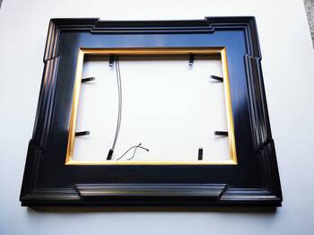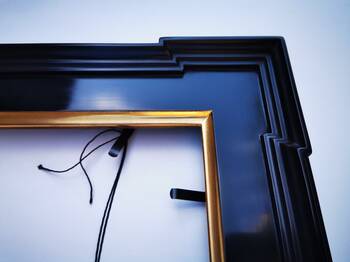 Rama jest pozłacana na wodę, co pozwala uzyskać głęboki, aksamitny połysk oraz subtelne przejścia tonalne. Klient może wybrać rodzaj złota-płatkowego oraz kolor glinki, aby dostosować ostateczny wygląd oprawy do charakteru obrazu.